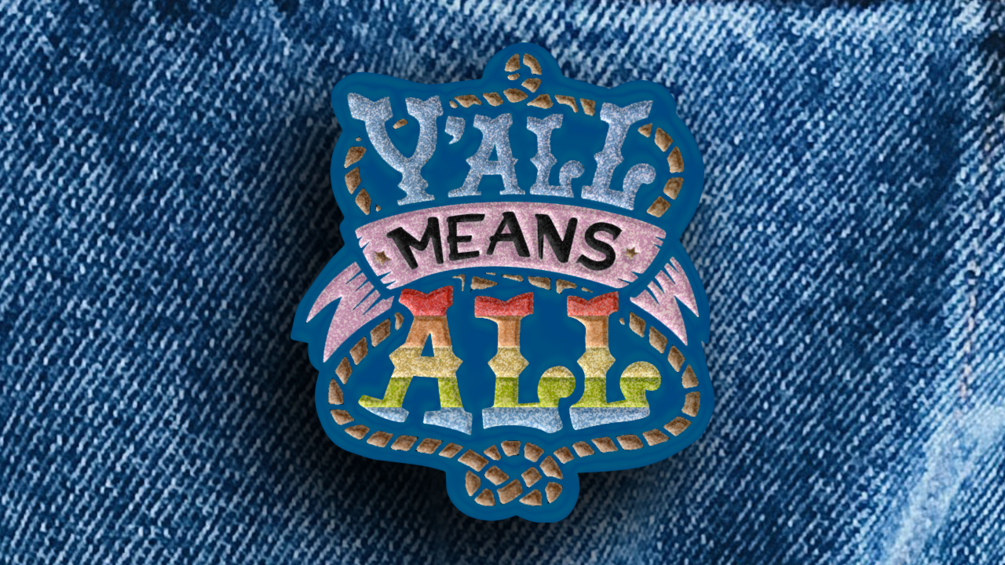 1 pc. Y'all Means All - Enamel Pin : Glitter enamel lettering sparkles on blue metal plating | Dimensions: 1.25" X 1.1"